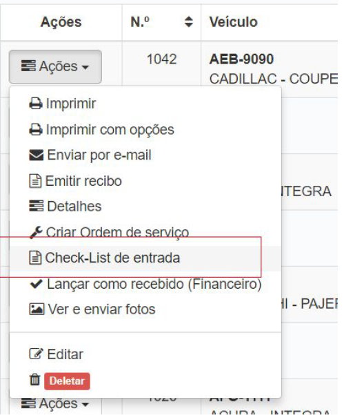Para criar um check-list, abra a lista de orçamentos ou O.S e escolha a opção Ações > Check-List de entrada. Quando criado um check-list no orçamento o mesmo estará disponível no O.S, caso a O.S seja criada a partir de um orçamento.