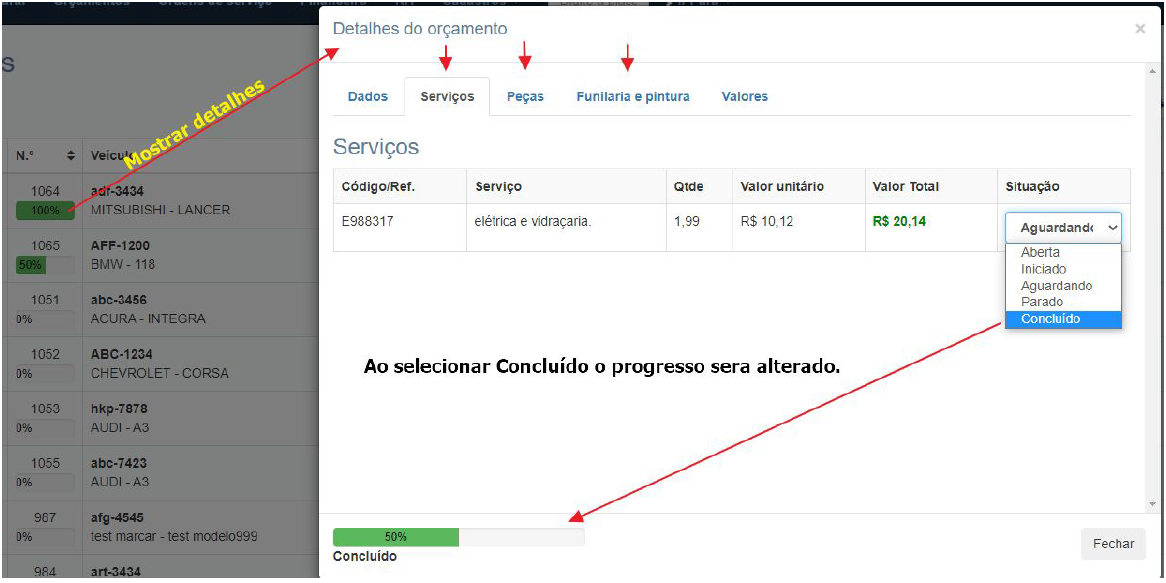 Na lista de orçamentos e O.S clique em Ações > Detalhes ou na porcentagem que aparece abaixo do número do orçamento ou OS, ao abrir a tela de detalhes clique na Aba Peças/Serviços ou Funilaria e altere a situação do item para o valor desejado. Quando selecionar Concluído o valor da porcentagem será alterado. Quando todos os serviços/peças e funilaria estiver marcado como Concluído a porcentagem será de 100%.
