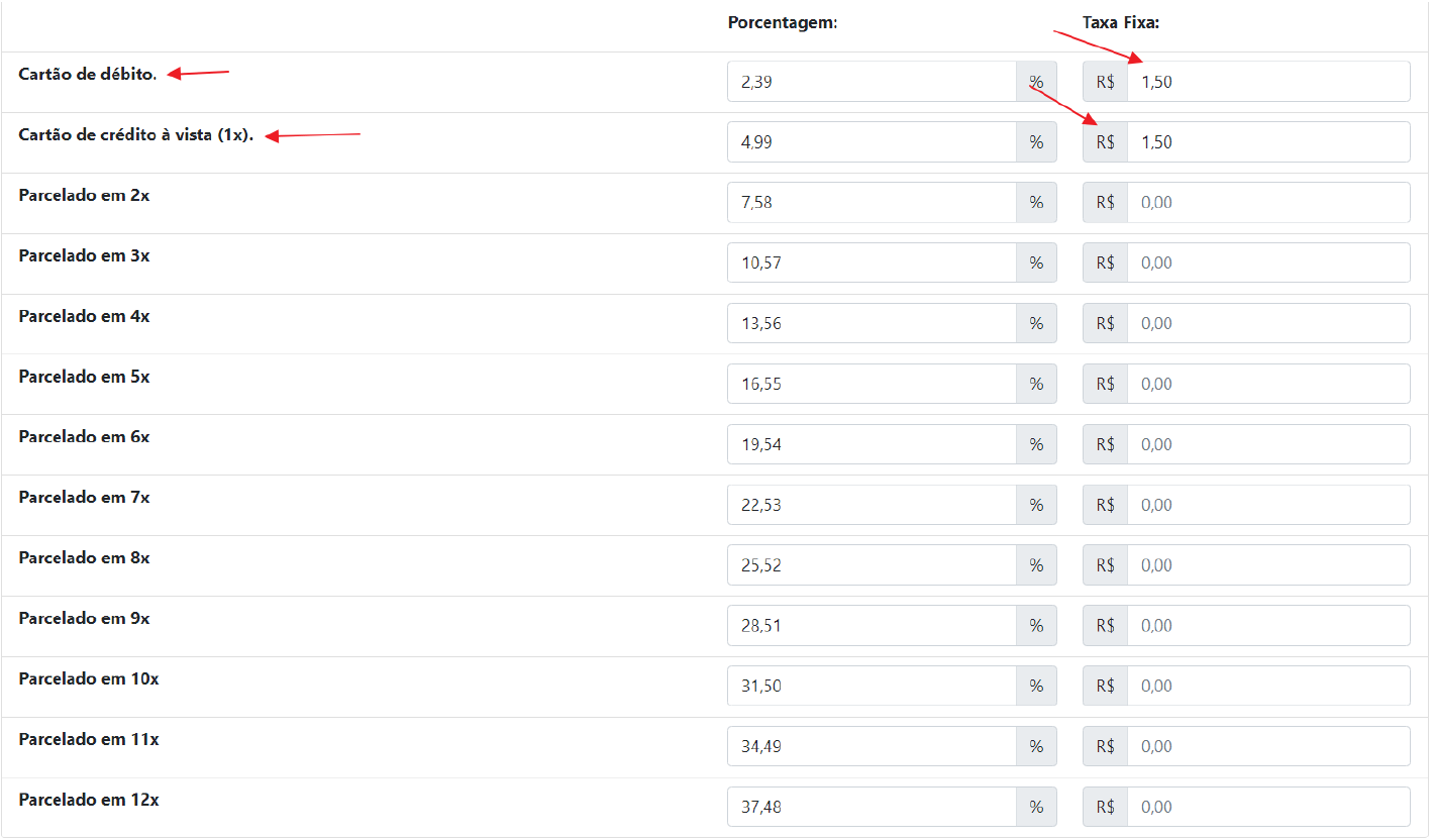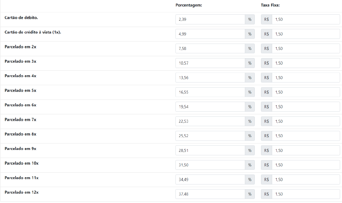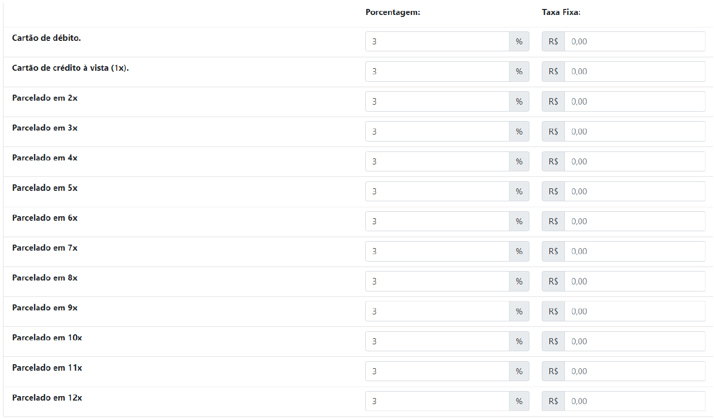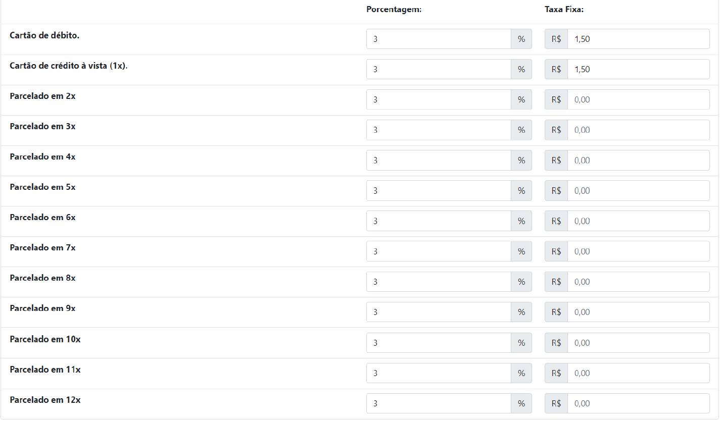 Mantém salvas as taxas aplicadas para cada parcela, o número máximo de parcelas é 12. É possível informar o valor em porcentagem e em reais. Essas preferências só precisam ser salvas uma vez ou quando precisar alteração. O sistema vai ler essas preferências para calcular as taxas.