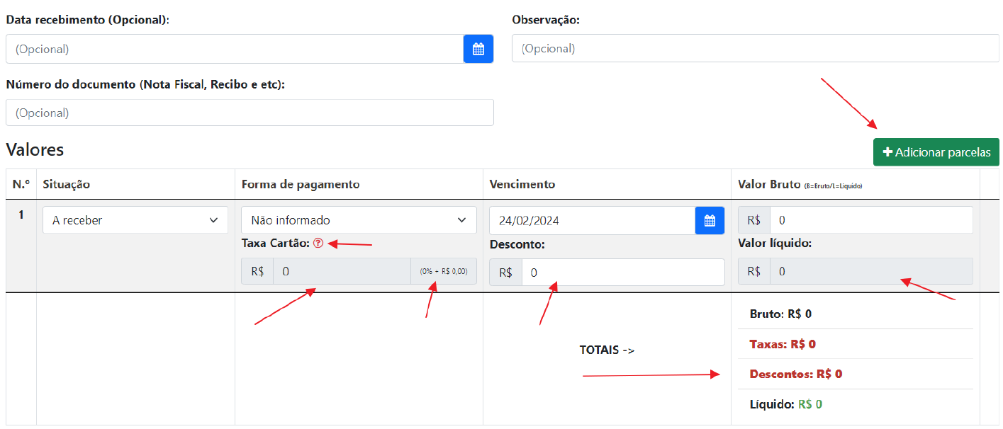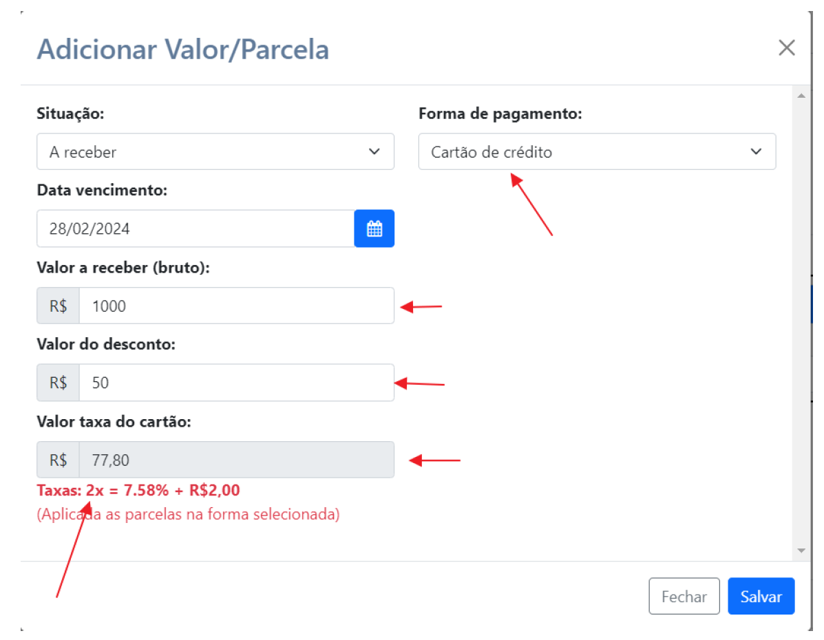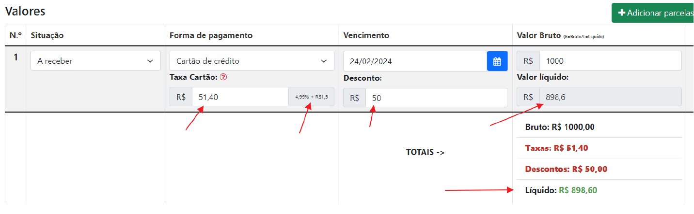 Para cada receita/parcelas é possível informar o desconto e calcular as taxas de cartão.